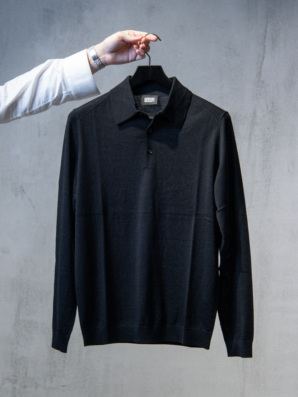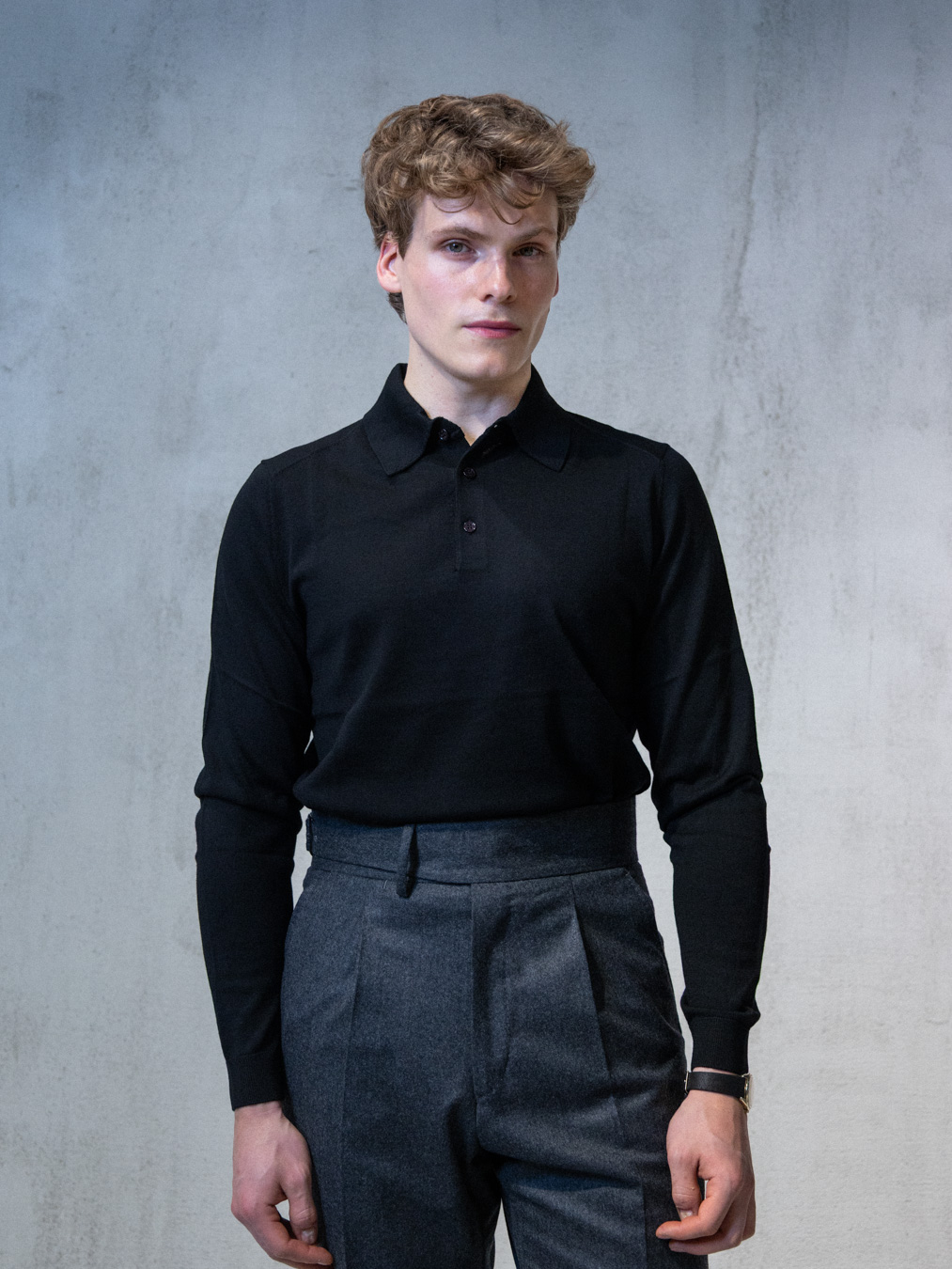 A timeless essential with a sharp twist. Made from 100% extrafine Merino wool, this polo long sleeve combines the ease of knitwear with a tailored silhouette. Lightweight yet warm, clean yet casual – perfect on its own or layered under a jacket. Available in multiple colors.